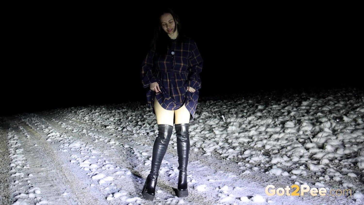 Pinky Cat In Black Leather Boots Pees In The Snow